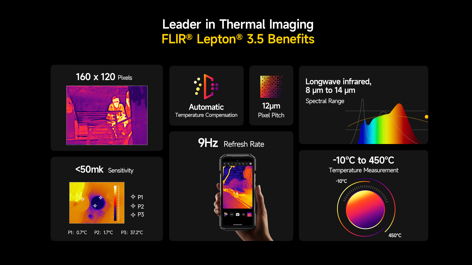 Cámara Térmica: | Resolución térmica 80 x 60, frecuencia de actualización, 9 Hz, píxeles 17 μm, Sensibilidad: <50mk, Rango de temperatura medible: -10 °C a 450 °C, Precisión: ±3 °C, Visualiza el calor invisible a simple vista, resaltando los contrastes de temperatura, Preinstalación de la aplicación MyFLIR Pro |