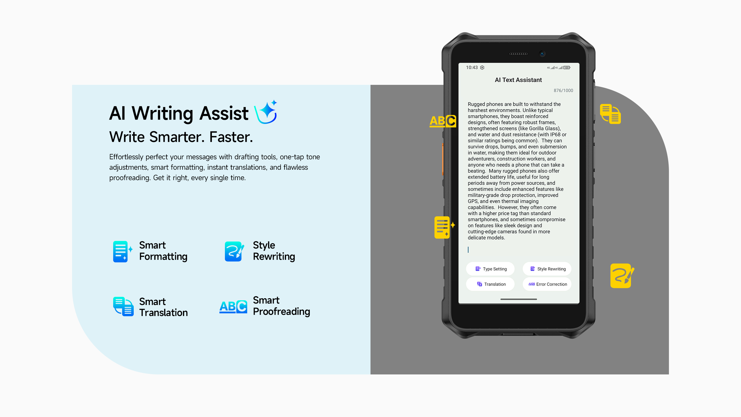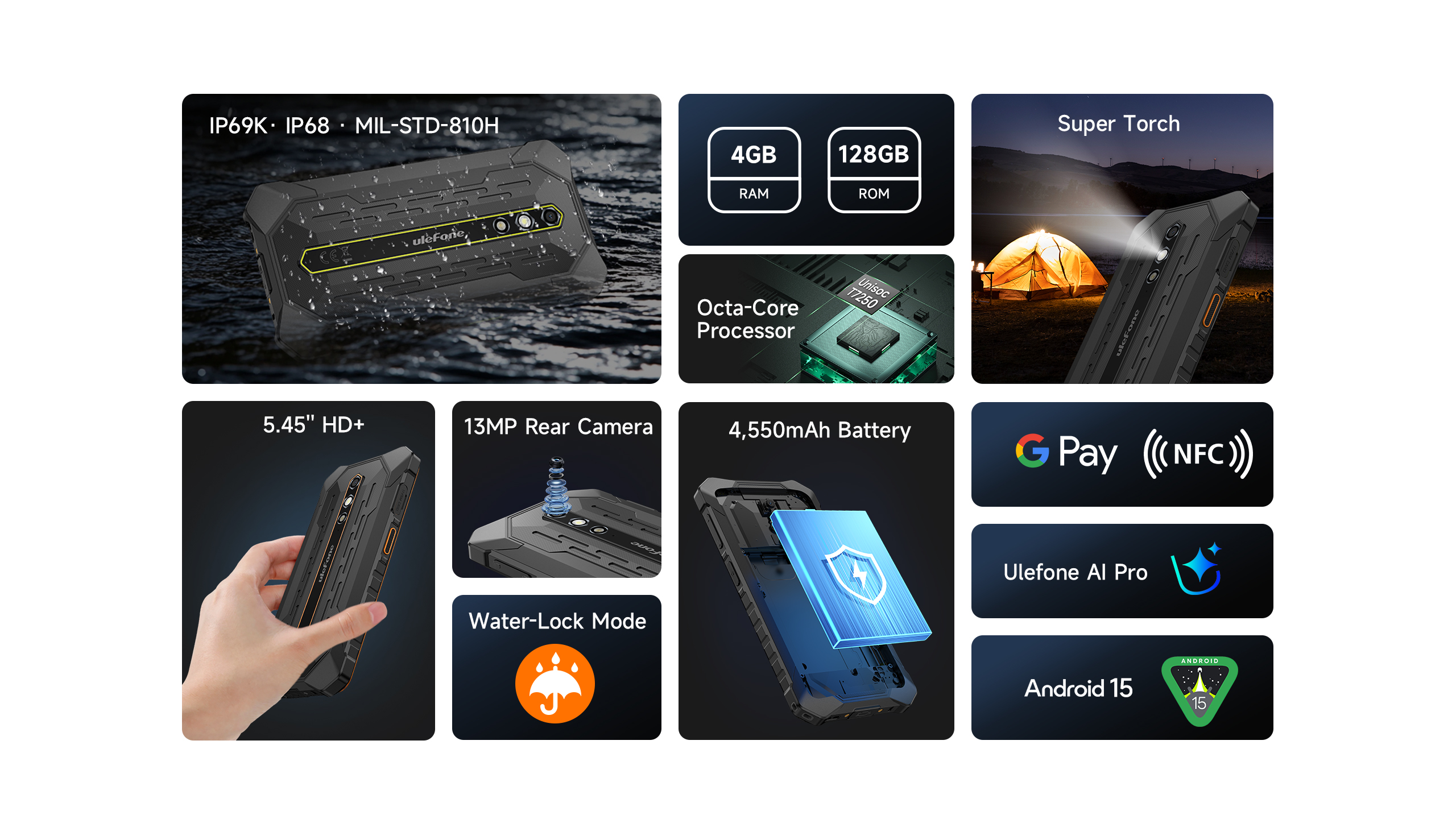 Su certificación IP68 lo protege contra el agua y el polvo, mientras que su construcción robusta resiste golpes, caídas y condiciones climáticas extremas, funcionando en temperaturas desde -30°C hasta 50°C.
