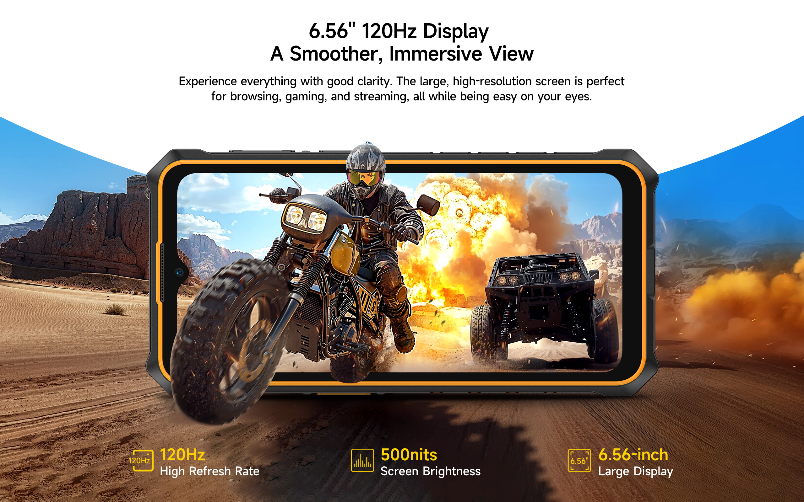 La pantalla de 6,56 pulgadas con tasa de refresco de 120 Hz ofrece imágenes fluidas y una experiencia visual cómoda para navegar, jugar o disfrutar de contenido multimedia.