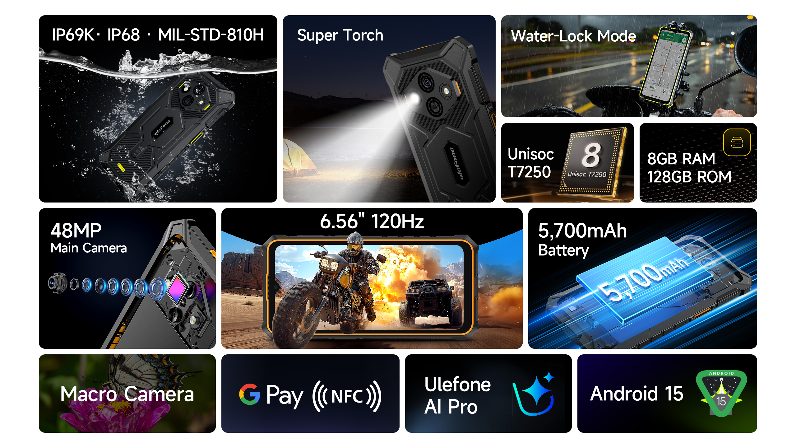 El Ulefone Rugking 3 Pro es un smartphone diseñado para quienes necesitan rendimiento potente, resistencia extrema y autonomía duradera en cualquier entorno. Con procesador octa-core, funciones de inteligencia artificial, cámara de alta resolución y certificación de resistencia militar, es el aliado perfecto tanto para el trabajo como para el día a día.